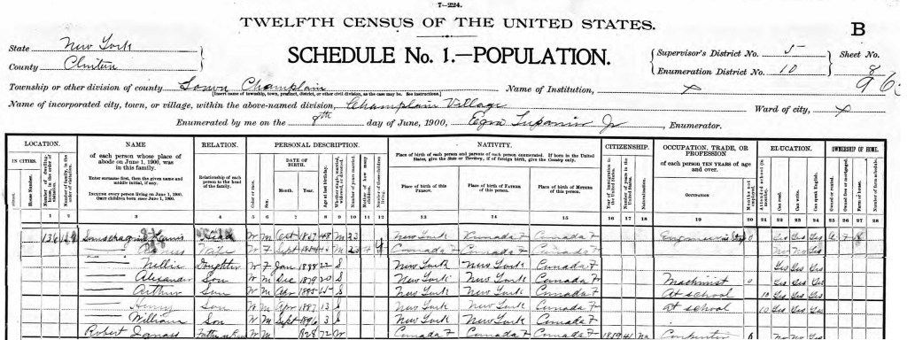 - 1900 U.S. Census, Champlain, NY, Lewis Sanschagrin household.