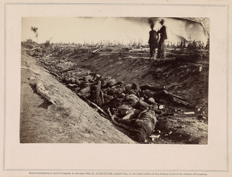 Source: Gardner, Alexander, Copyright Claimant, Gardner, Alexander, photographer. Ditch on right wing, where a large number of rebels were killed at the Battle of Antietam. Antietam United States Maryland, 1862. [Sept] Photograph. https://www.loc.gov/item/2014646926/.
