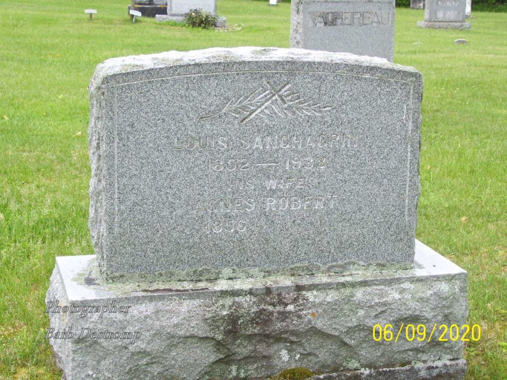 - Find A Grave, “Emily Sanchagrin (1815–1887),” Memorial 95944075, citing Saint Joseph’s Cemetery, Coopersville, Clinton County, New York, accessed April 14, 2026, https://www.findagrave.com/memorial/95944075/emily-sanchagrin. Find A Grave, “Louis Sanchagrin (1810–1908),” Memorial 95944240, citing Saint Joseph’s Cemetery, Coopersville, Clinton County, New York, accessed April 14, 2026, https://www.findagrave.com/memorial/95944240/louis-sanchagrin.